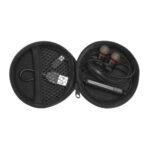 Plástico. Audífonos bluetooth. Cable de 70 cm aprox. Botones para aumentar / disminuir el volumen, aceptar y rechazar una llamada. Los audifonos son imantados. En uno de los costados entrada mini usb para recargar la batería. Estuche redondo de Eva Pouch. Incluye repuestos para los audífonos.