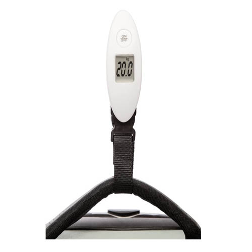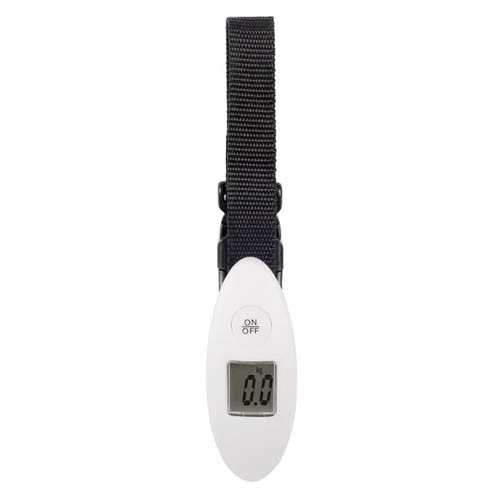 Plástico. Balanza digital de mano, botón de off/on. Cuenta con una correa para enganchar en la manilla de la valija/bolso al elevar devuelve el peso. Peso máximo soportado 40 Kg.