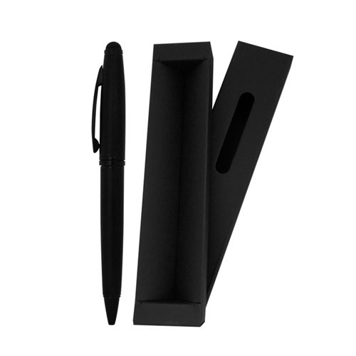 Elegante lápiz metálico negro, enlacado. Incluye pulsador touch para smartphone y pantallas táctiles. Empaque de cartón forrado negro. Tinta negra