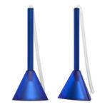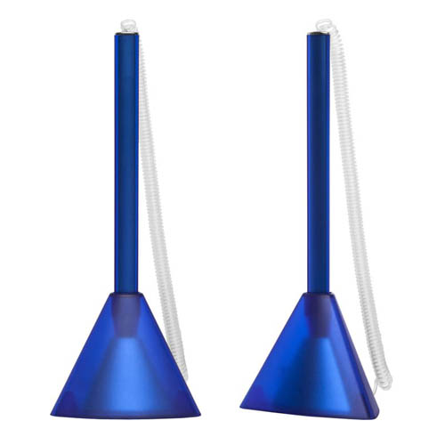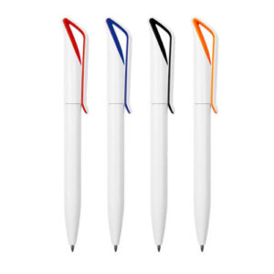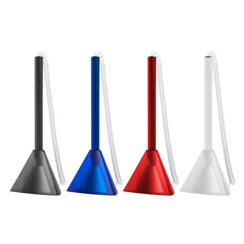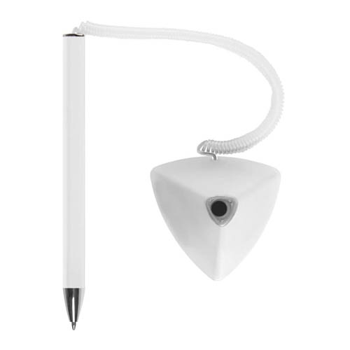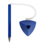 Base 6 x 5,5 cm. Plástico. Bolígrafo con base adhesiva que permite fijarse en un escritorio. Cuerpo de color y puntera metálica color plata. Tinta azul.