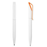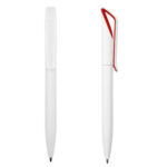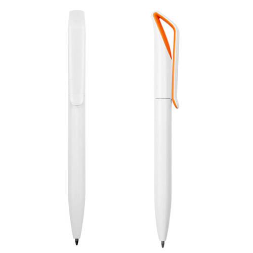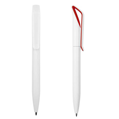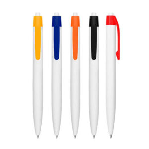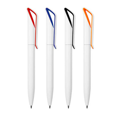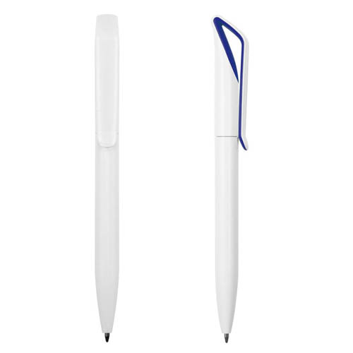 Plástico. Cuerpo color blanco. Clip en su interior con detalle de color. Apertura giratoria. Tinta azul.