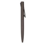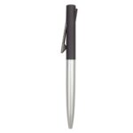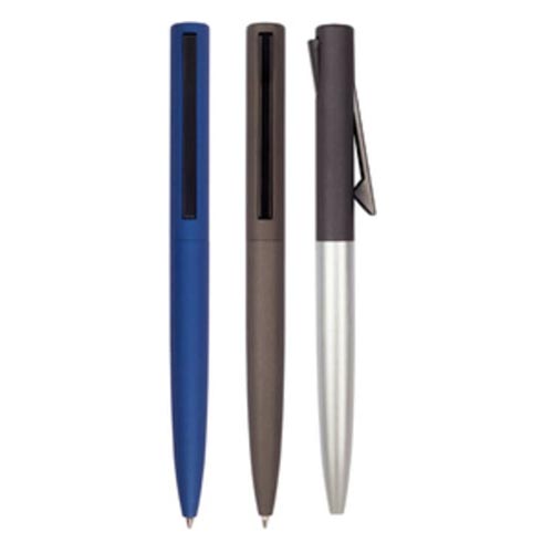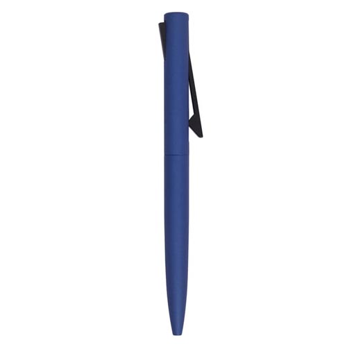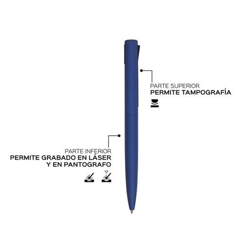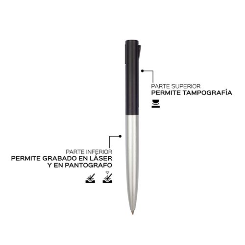 Metal. Cuerpo en metal, parte superior plástica con detalle de color negro. El clip funciona como pulsador. Ideal para imprimir en tampografia. Tinta azul.
