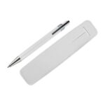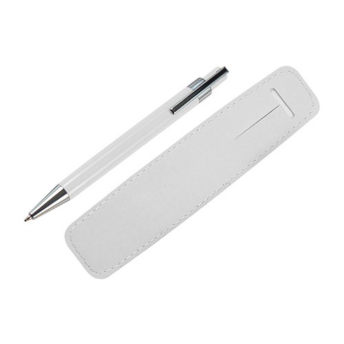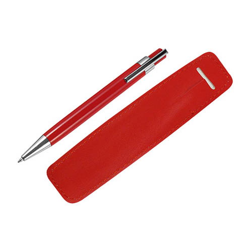 Bolígrafo Metálico de color, con funda de simil cuero al tono. Escritura Azul.