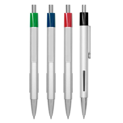 Metálico. Pulsador, clip y puntera metálicos. Cabezal cuadrado de color. Gomas laterales antideslizantes. Tinta negra.