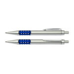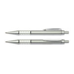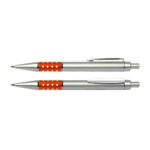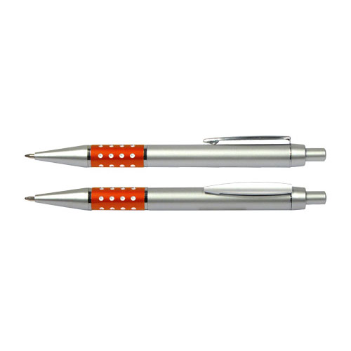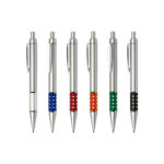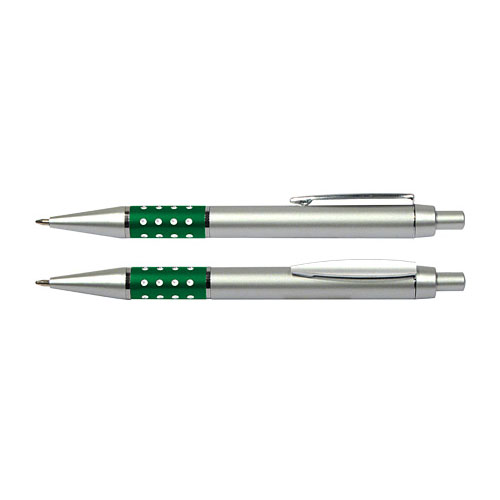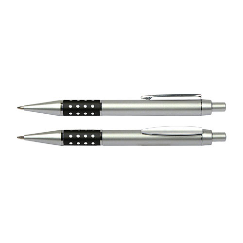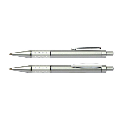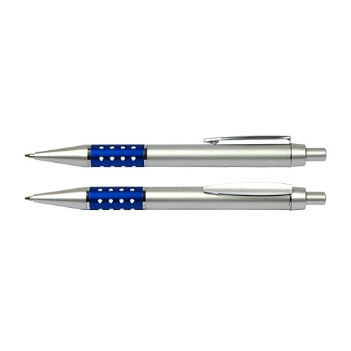 Bolígrafo Plástico Metalizado modelo “Alum”, con anillo metálico con orificios. Escritura azul.