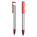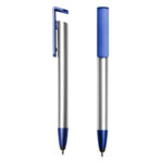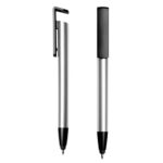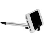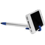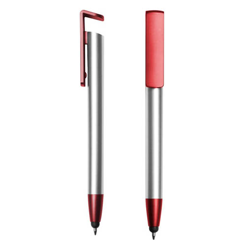 Bolígrafo. Plástico. Cuerpo plástico plateado y detalles de color. El clip tiene un ranura que funciona para soporte de celular. Puntera touch. Tinta negra.