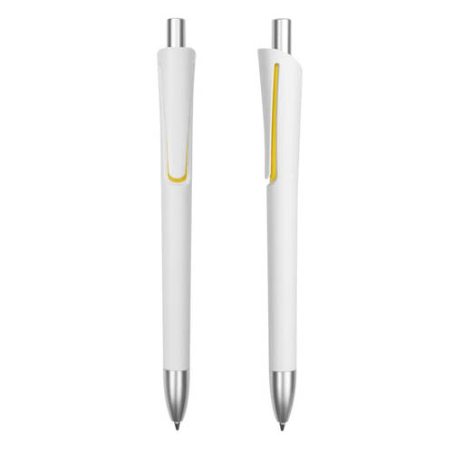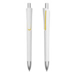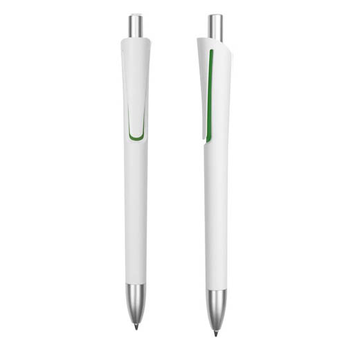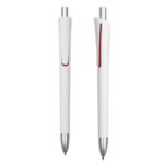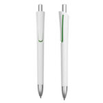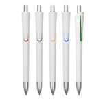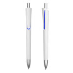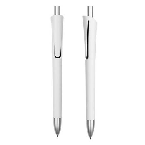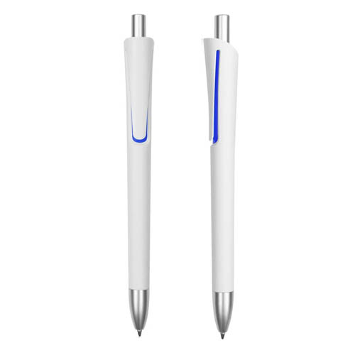 Plástico. Cuerpo blanco mate. Clip, punta y pulsador color plata. Debajo del clip detalle de color. Tinta azul.