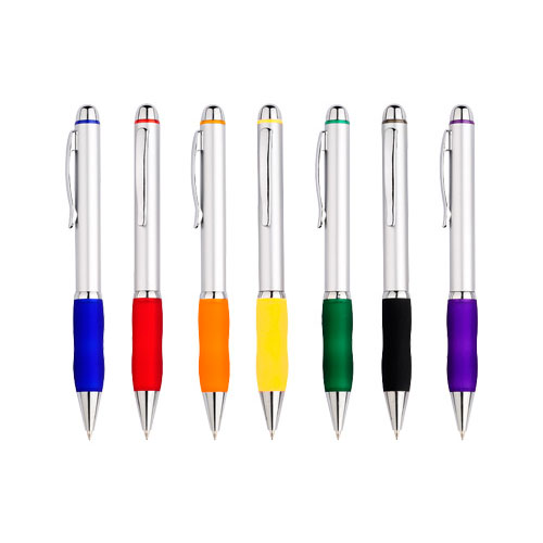 Bolígrafo plástico metalizado “Qasar” con goma de color. Escritura azul.
