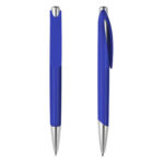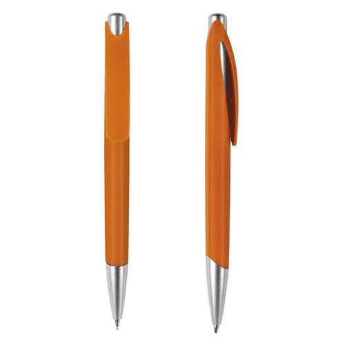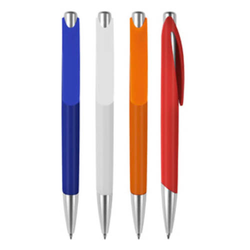 Plástico. Cuerpo de color y detalles de color plata debajo del clip, pulsador y puntera. Tinta azul.