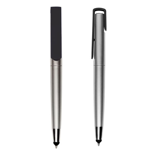 Plástico con apertura giratoria, puntera touch para pantallas táctiles. Clip plástico apto para impresión. Tinta negra.