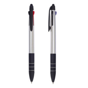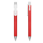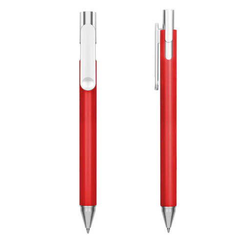 Plástico. Bolígrafo con pulsador. Cuerpo plástico de color. Pulsador, clip y puntera plásticos color plata. Detalle en el clip. Tinta azul.