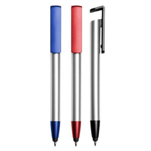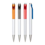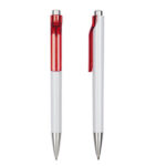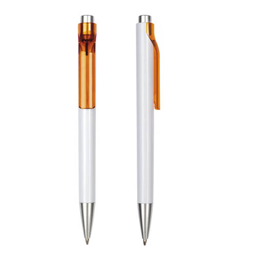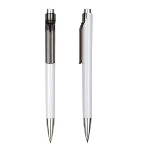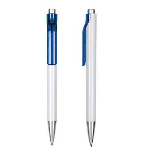 Plástico. Cuerpo blanco. Pulsador y punta color plata. Clip con detalle de color transparente. Tinta azul.