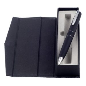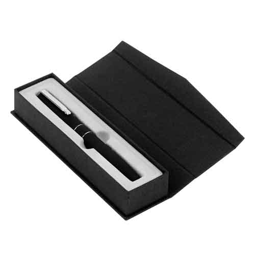 Metal. Cuerpo metálico engomado. Clip y detalles color plata. Tinta gel negro. Estuche con cierre magnético. Área de impresión: Ø 0,8 x 5 cm. Destape electroplateado en la parte superior.