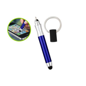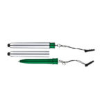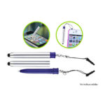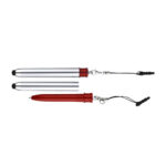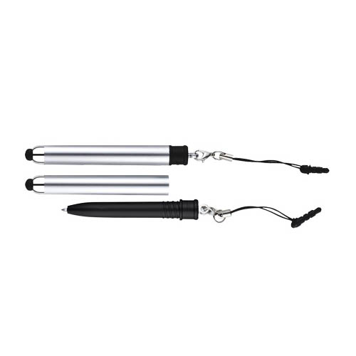 Bolígrafo “Touch-Screen” con tapa plateada y goma posterior negra para pantalla táctil. Incluye práctico soporte plástico para insertar en la salida de auricular del iPhone. Escritura azul.
