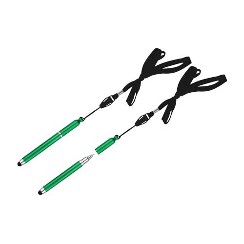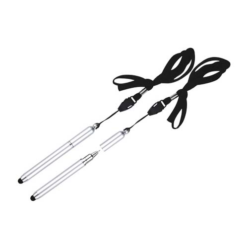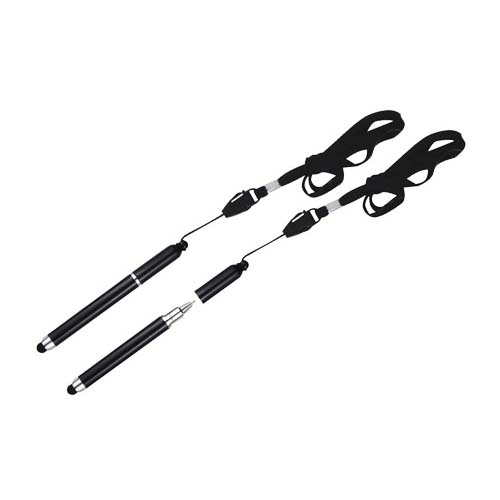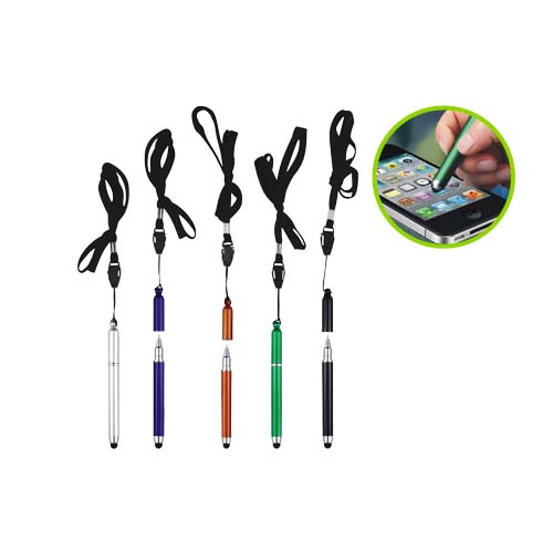 Bolígrafo “Touch-Screen” con goma posterior negra para pantalla táctil. Incluye lanyard colgante negro. Escritura azul.
