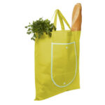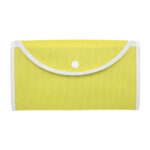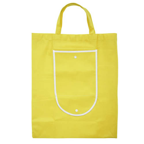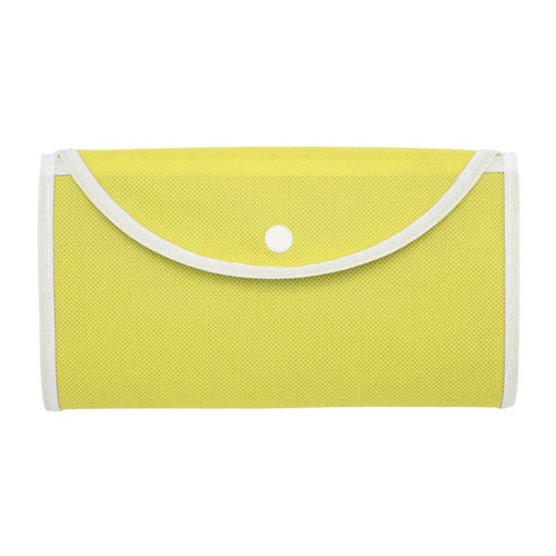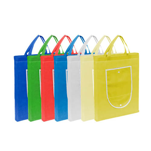 Non-woven. Bolsa que posee un bolsillo frontal con bordes blancos alrededor y un cierre de botón.