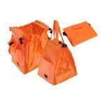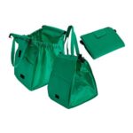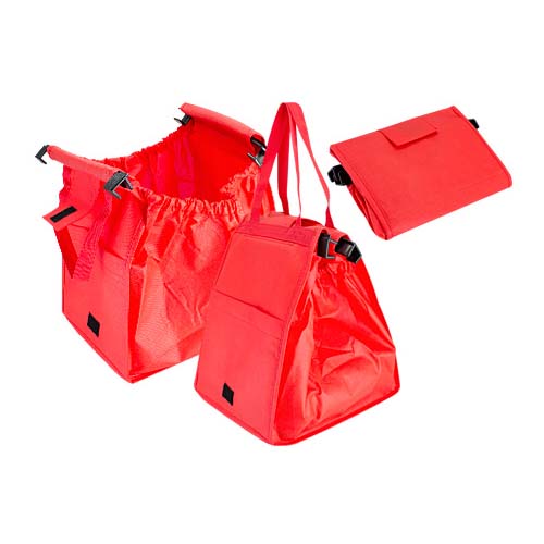 Bolsa reutilizable de tela no tejida (TNT) super-resistente de 120g/m2. Cuenta con 2 asas de 40cm. c/u aprox. Contiene 2 soportes plásticos rígidos negros, para enganchar en las paredes laterales de los carros de supermercados tradicionales. Sistema de cierre pestaña con velcro, bolsillo lateral y frontales superiores elasticados para maximizar la superficie de apertura sobre el carro. 100% plegable para fácil transporte y guardado.