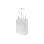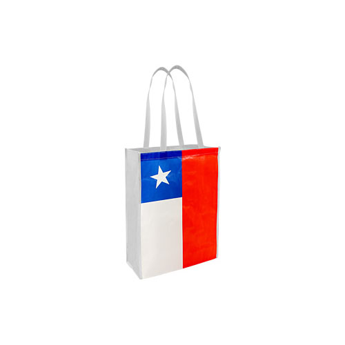 Bolsa reutilizable de Tela No Tejida (TNT) de 80 g/m2. Incluye gráfica termolaminada de Bandera chilena por el anverso y por el reverso es 100% blanca, ideal para impresión de logo. Cuenta con 2 asas de 60cm. c/u aprox.