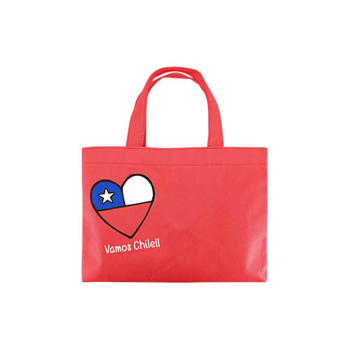 Bolsa reutilizable de Tela No Tejida (TNT) de 80 g/m2. Cuenta con 2 asas de 30cm. c/u aprox. Incluye impresión “Vamos Chile” a 3 colores, en el frente.