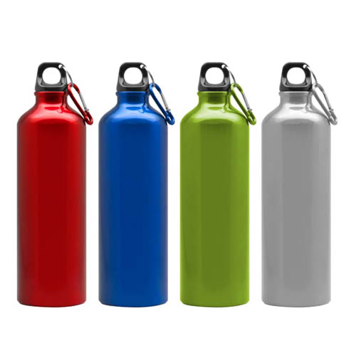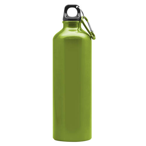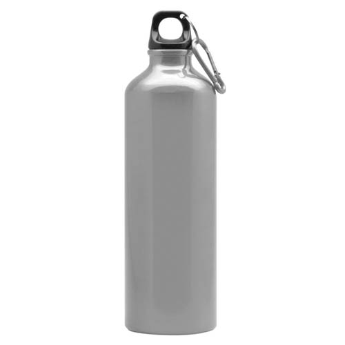 Capacidad 800 ml. Aluminio. Botella de aluminio. Tapa de rosca plástica y gancho metálico.