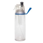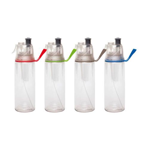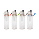 Capacidad 550 ml. Plástico. Tapa plástica a rosca, boquilla deportiva engomada y rociador con gatillo que tira una suave lluvia. Correa de color.