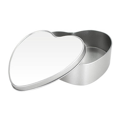 Caja Metálica con forma de Corazón, con tapa y cubierta blanca para Sublimación. Presentación en bolsa de Polipropileno + caja de cartón forrado color natural. Ideal para usar como joyero, especiero o guarda-accesorios. Un regalo práctico y delicado para cualquier mujer.