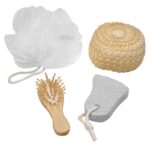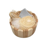 Canasto SPA de belleza en madera modelo “Naturals”. Contiene cepillo de pelo, esponja malla, piedra pomez y esponja de masaje corporal.
