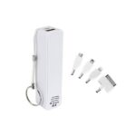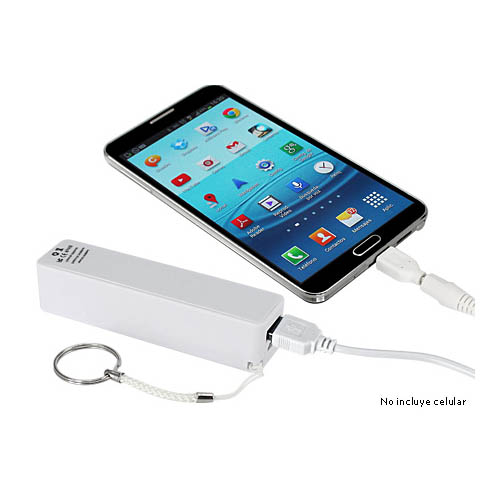 Llavero-Power Bank cargador USB portátil plástico. Capacidad 2000mAh. Incluye cable USB + 4 adaptadores para compatibilidad iPhone 5 & 6, Samsung Galaxy, mini-USB, etc. Batería recargable incorporada. Presentación en caja de regalo de acrílico transparente.