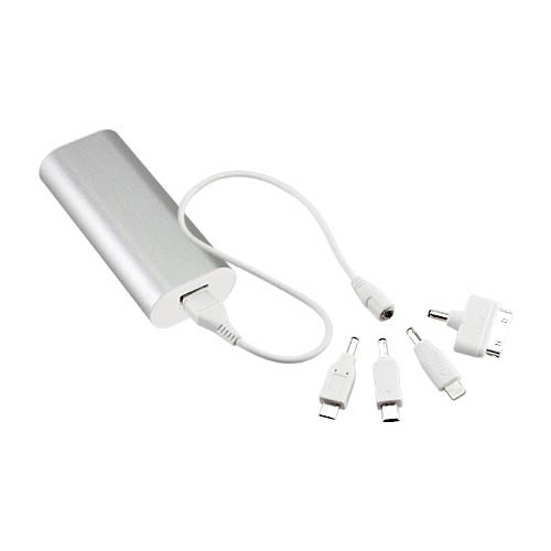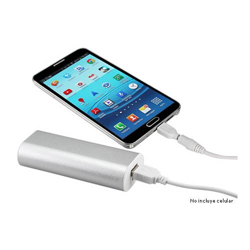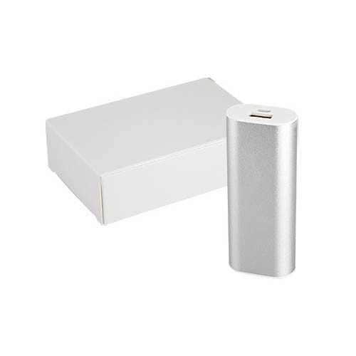 Cargador Power Bank USB metálico. Capacidad 5200mAh. Incluye cable USB + 4 adaptadores para i-Phone, i-Pad, Samsung Galaxy, Xperia, mini-USB, etc. Batería recargable incorporada. Presentación en caja de regalo laminada blanca.