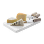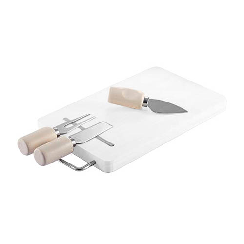 Cheese Set con 3 prácticas herramientas para quesos + tablero de madera de Hevea (Rubberwood). Incluye banda magnética sobre la tabla, para fijar las herramientas a ella.