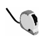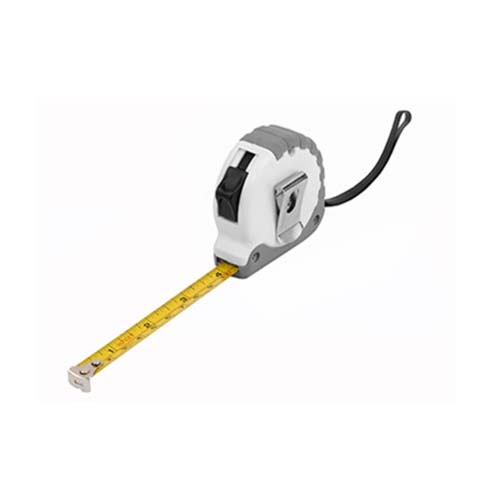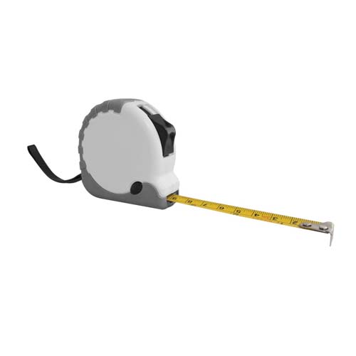 Plástico y metal. Carcasa plástica con detalle en hule. Cinta metálica.con 3 mts de longitud. Escalas de medida en cm y pulgadas.