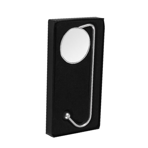 Colgador Metálico de sobremesa para Bolsos y Carteras. Presentación en estuche laminado negro con cuna aterciopelada.