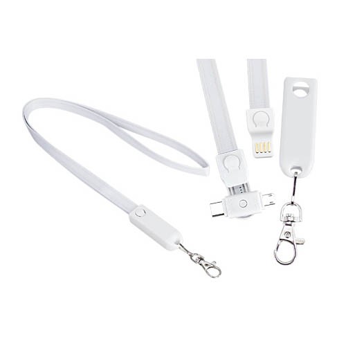 Connect Lanyard Multicargador, con terminal de carga USB y multicables Micro USB / iPhone / Type C. Incorpora nueva tecnología de cable cargador dual Micro USB y iPhone (en el mismo terminal). Compatible con dispositivos Android, Apple y Type C. Lanyard de poliéster de 90 x 1.3cm. Terminal plástico ABS blanco giratorio con tapa. Presentación en bolsa OPP con gráfica descriptiva. Producto con aprobación CE, ROHS, FC.