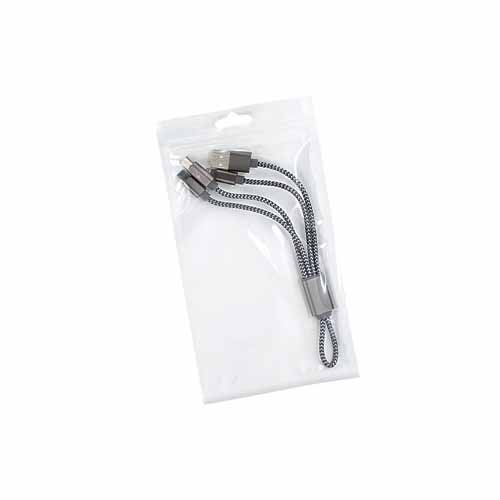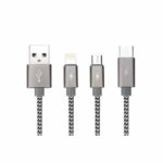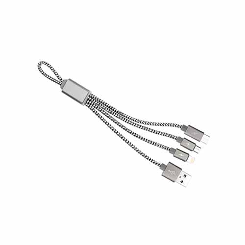 Deluxe Connect Multicargador 4-en-1 Metálico color Gris Titanio. Multi-cables con terminales de carga USB / Micro USB / iPhone / Type C. Compatible con dispositivos Android, Apple y Type C. Presentación en elegante bolsa OPP con orificio para colgador de ganchera. Producto con aprobación CE, ROHS, FC.
