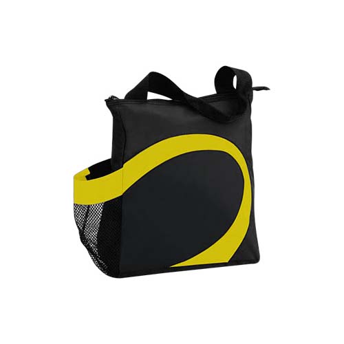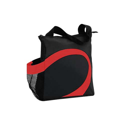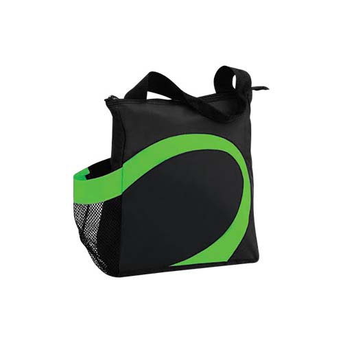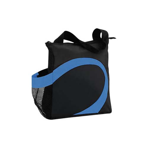 Cooler modelo “Wave”. Tela exterior Polyester 70D/PVC. Tela interior plateada aislante 15C PEVA + relleno 3mm esponja PE. Cierre cremallera superior. Incluye bolsillo lateral en tela malla.