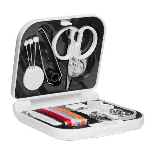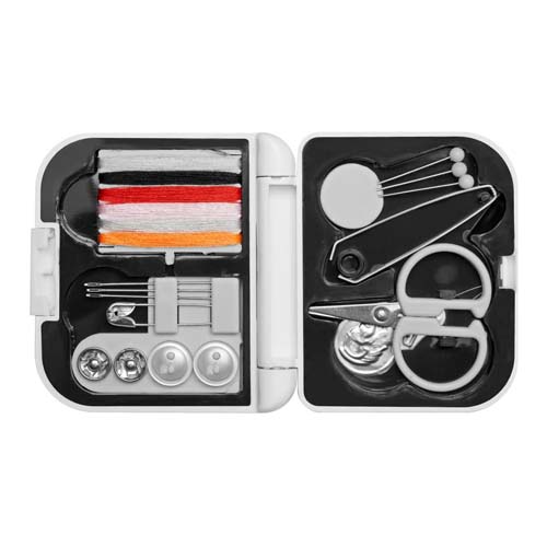 Plástico. Contiene tijeras, enhebrador, pinza, alfileres, botones, alfiler de gancho, agujas e hilos de colores.