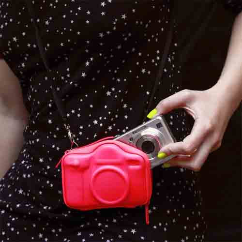 Estuche multiuso para cuidar una cámara, usar como billetera, portadocumentos, o como carterita para llevar sólo lo indispensable. Cuerina. 12,5 x 10 x 3 cm. Correa para colgar de 95 cm de largo.