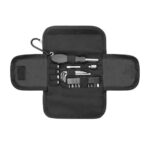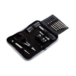 Acero y plástico. Set de herramientas de 19 piezas. Destornillador con 10 puntas diferentes, 3 llaves Allen, 4 llaves tubo de 4 medidas y alargue. Estuche con cierre de velcro y gancho.
