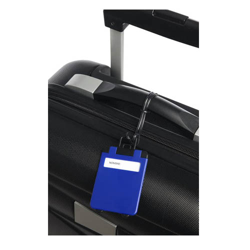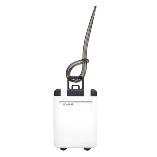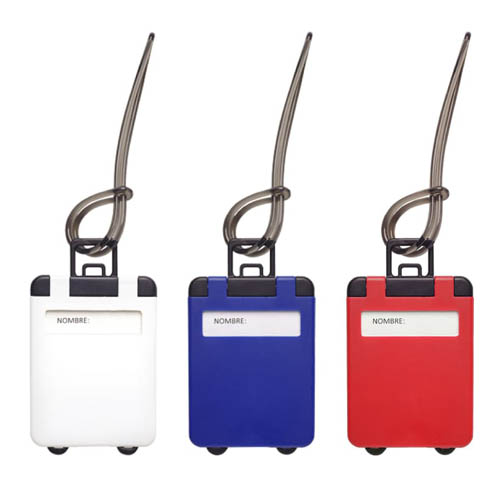 lástico. Identificador en formato de maleta. Cuenta con etiqueta para poner nombre. Lazo de plástico para colgar en la manija del equipaje.
