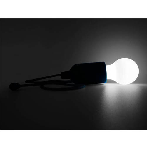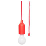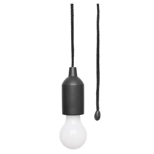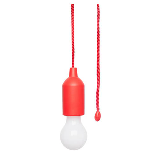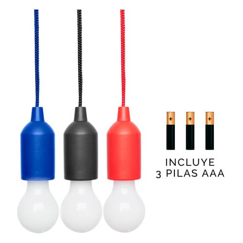 Plástico. Lampara con luz led. Contiene un lazo que al tirarlo enciende y apaga la luz de la bombilla. Utiliza 3 baterías AAA incluidas.