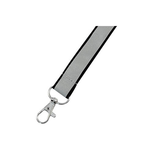 Lanyard Reflectante Plateado. Reverso polyester negro de 2 cm de ancho, con terminación mosquetón metálico.