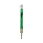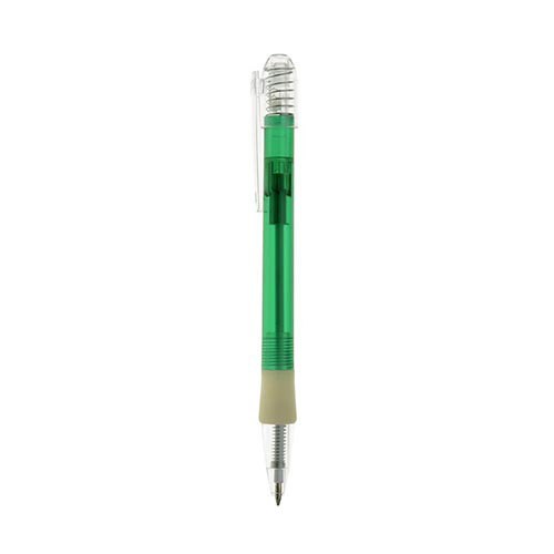 Lápiz plástico translúcido, con punta y pulsador retráctil transparente y goma antideslizante en empuñadura.
