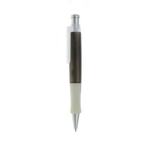 Lápiz plástico empavonado translúcido, con goma antideslizante en empuñadura, con aplicación silver en pulsador retráctil y punta.