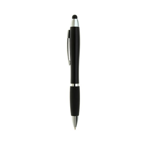Lápiz plástico metalizado con clip metálico, aplicaciones silver en punta, cintura, pulsador retráctil y goma antideslizante en empuñadura. Tinta azul.