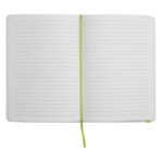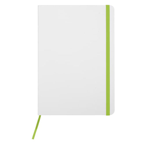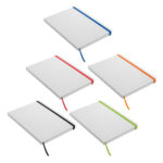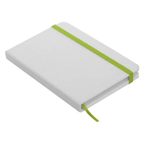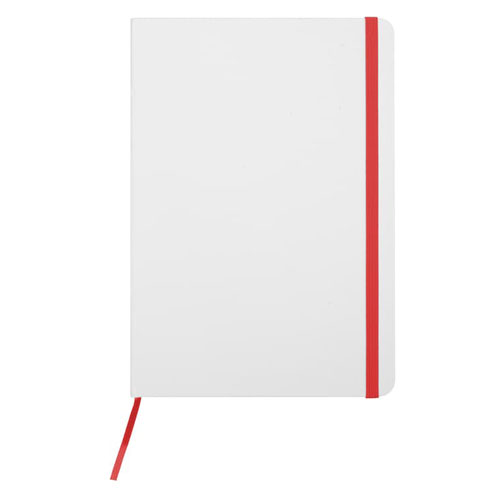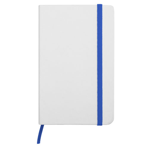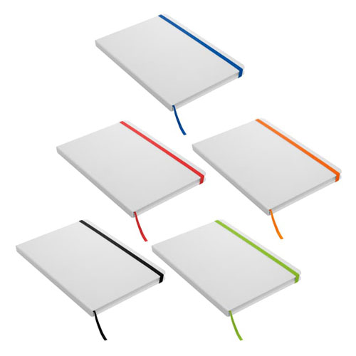 Cartón. Libreta de tapa dura color blanco. Contiene 80 hojas rayadas, señalador y cierra con banda elástica del mismo color.