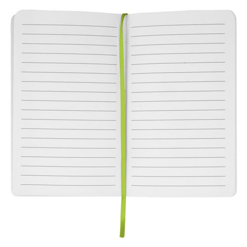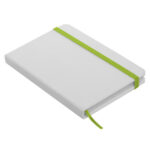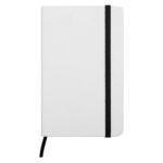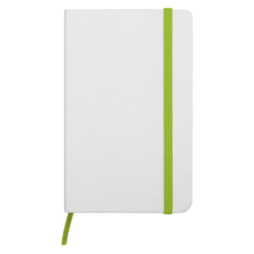 Cartón. Libreta de tapa dura color blanco. Contiene 80 hojas rayadas, señalador y cierra con banda elástica del mismo color.