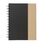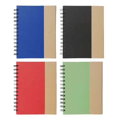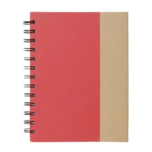 Cuaderno de cartón con espiral. Dos autoadhesivos rectangulares (grande y mediano), cinco autoadhesivos señaladores de diferente color y bolígrafo. 80 Hojas rayadas.