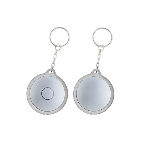 Llavero-Linterna LED redondo, con cuerpo plateado y anillo (borde) de color traslúcido.