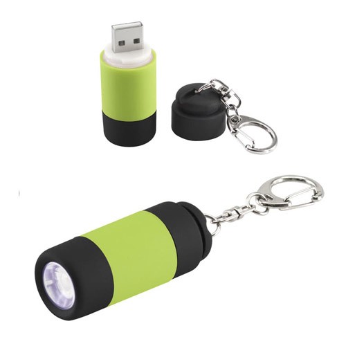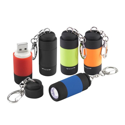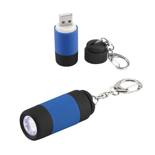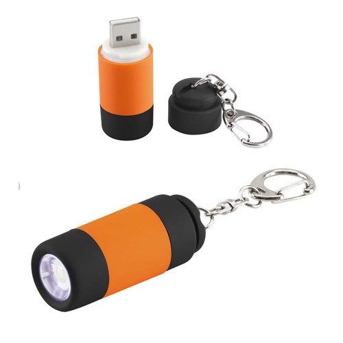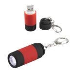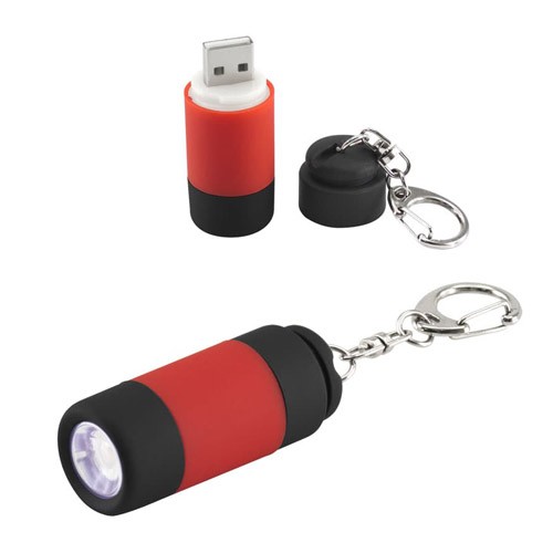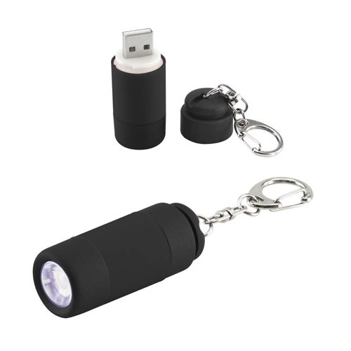 Llavero-Linterna LED con terminal USB para recarga (Batería recargable). Elegante cuerpo de silicona negro/color. Presentación en Estuche de Regalo plateado.