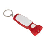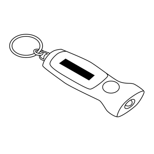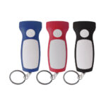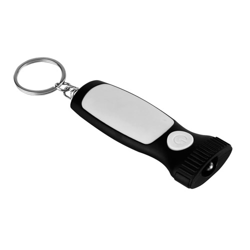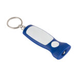 Llavero linterna. Botón de encendido. Cuerpo en color con detalle de área de impresión en blanco. Aro metálico. Contiene 3 pilas boton incorporadas.
